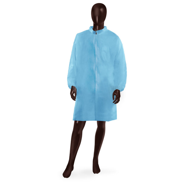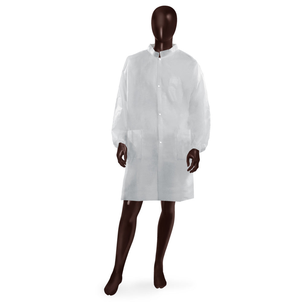 Il camice monouso Ajsia 17261 MAO COLLAR 50 è realizzato in PLP, con colletto alla coreana, chiusura con automatici, elastico ai polsi, due tasche esterne e una interna lato cuore.