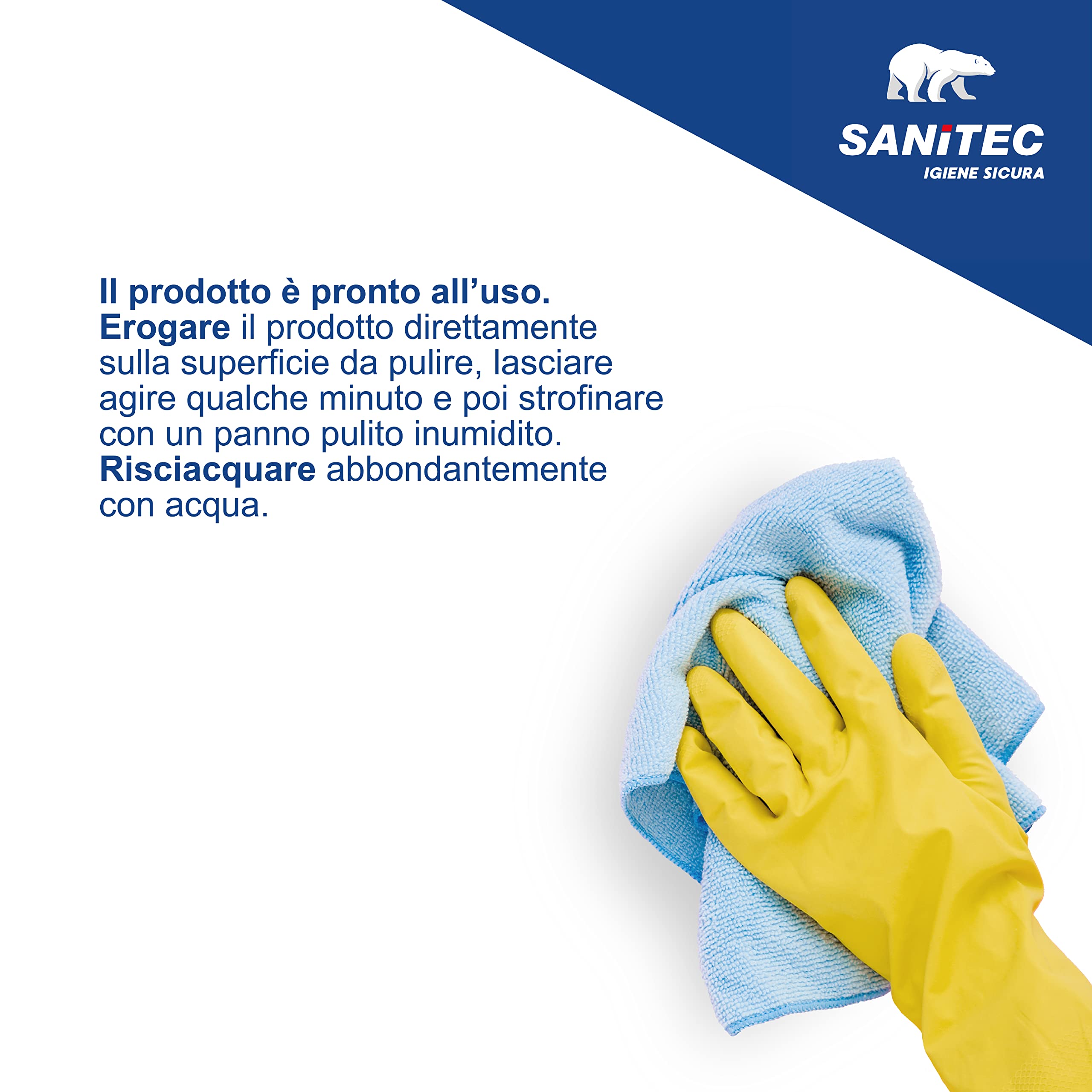 Il prodotto è pronto all'uso. Erogare il prodotto direttamente sulla superficie da pulire, lasciare agire qualche minuto e poi strofinare con un panno pulito inumidito. Risciacquare abbondantemente con acqua.