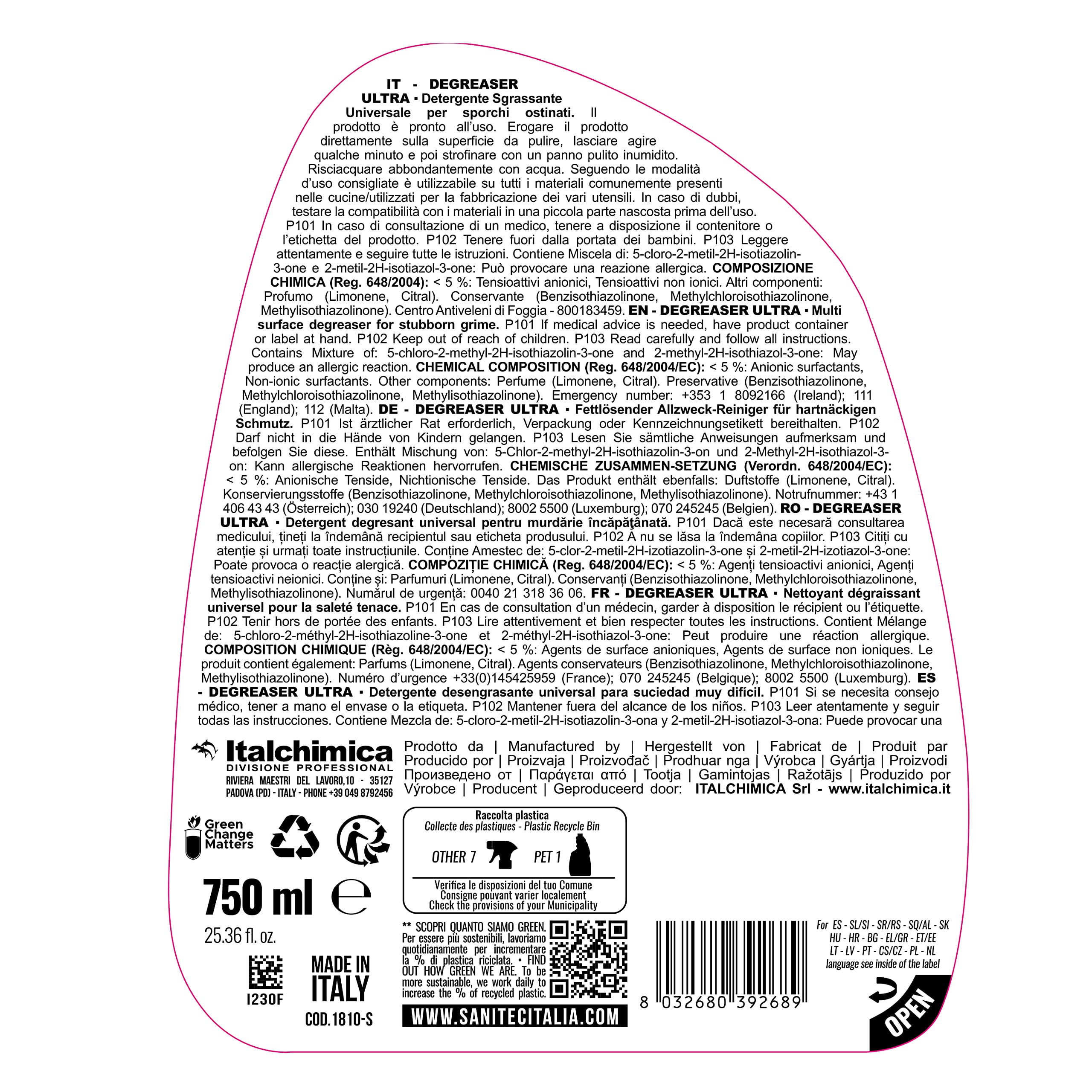 - I tensioattivi contenuti sono biodegradabili secondo i criteri definiti dalla Direttiva Europea 648/2004/CE e successive modifiche