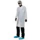 Il kit visitatore Ajsia 14063 KIT PLP è composto da una cuffia clip in PLP, un camice in PLP con tasca interna lato cuore comoda come porta penne o oggetti, mascherina in carta ad 1 velo e copriscarpe in CPE.