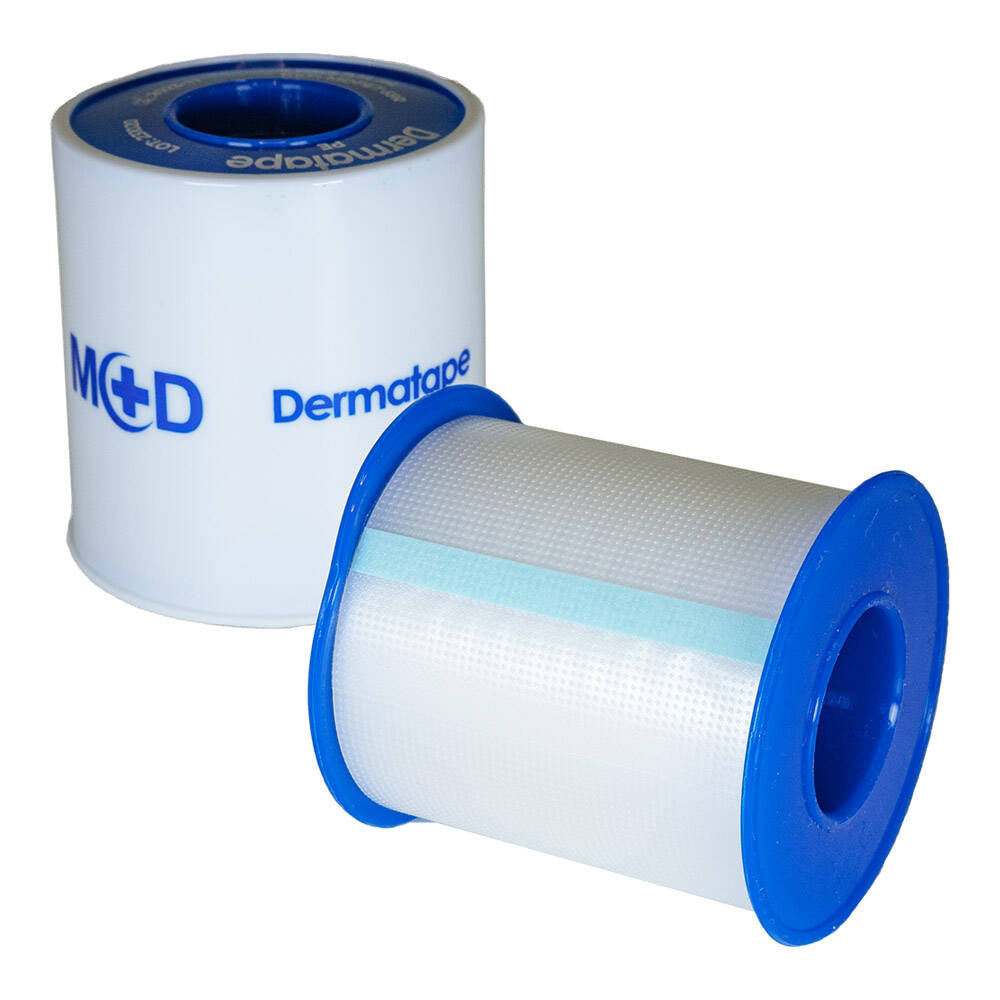- DERMATAPE PE: Nastro in PE trasparente microforato, controllo visivo della cute, favorisce traspirazione, resistente all'acqua.
