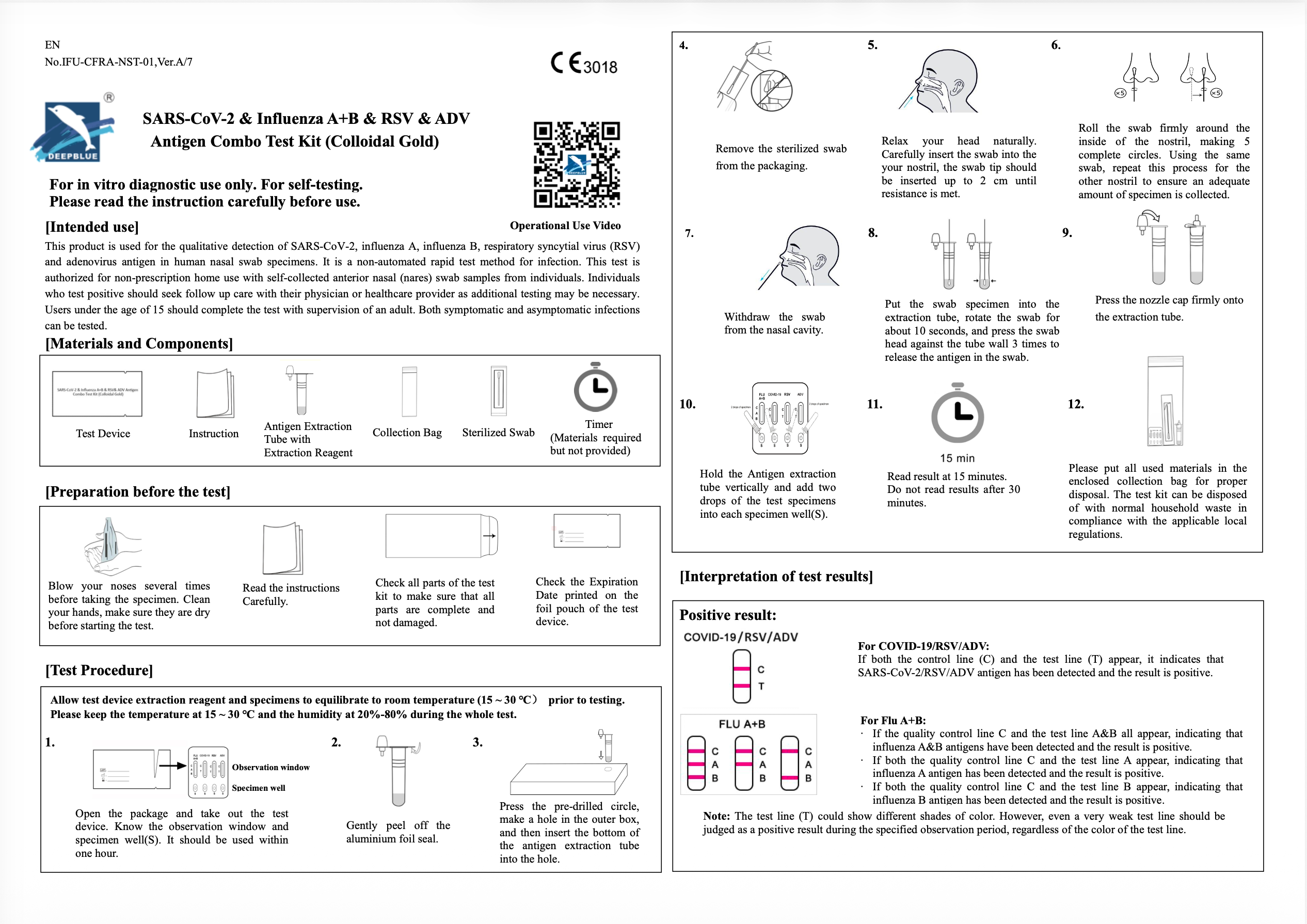 Test rapido DeepBlue 5-in-1 Multiplex Respiratory self test - kit da 10 a 20 test (Covid-19, Influenza A+B, RSV, ADV)