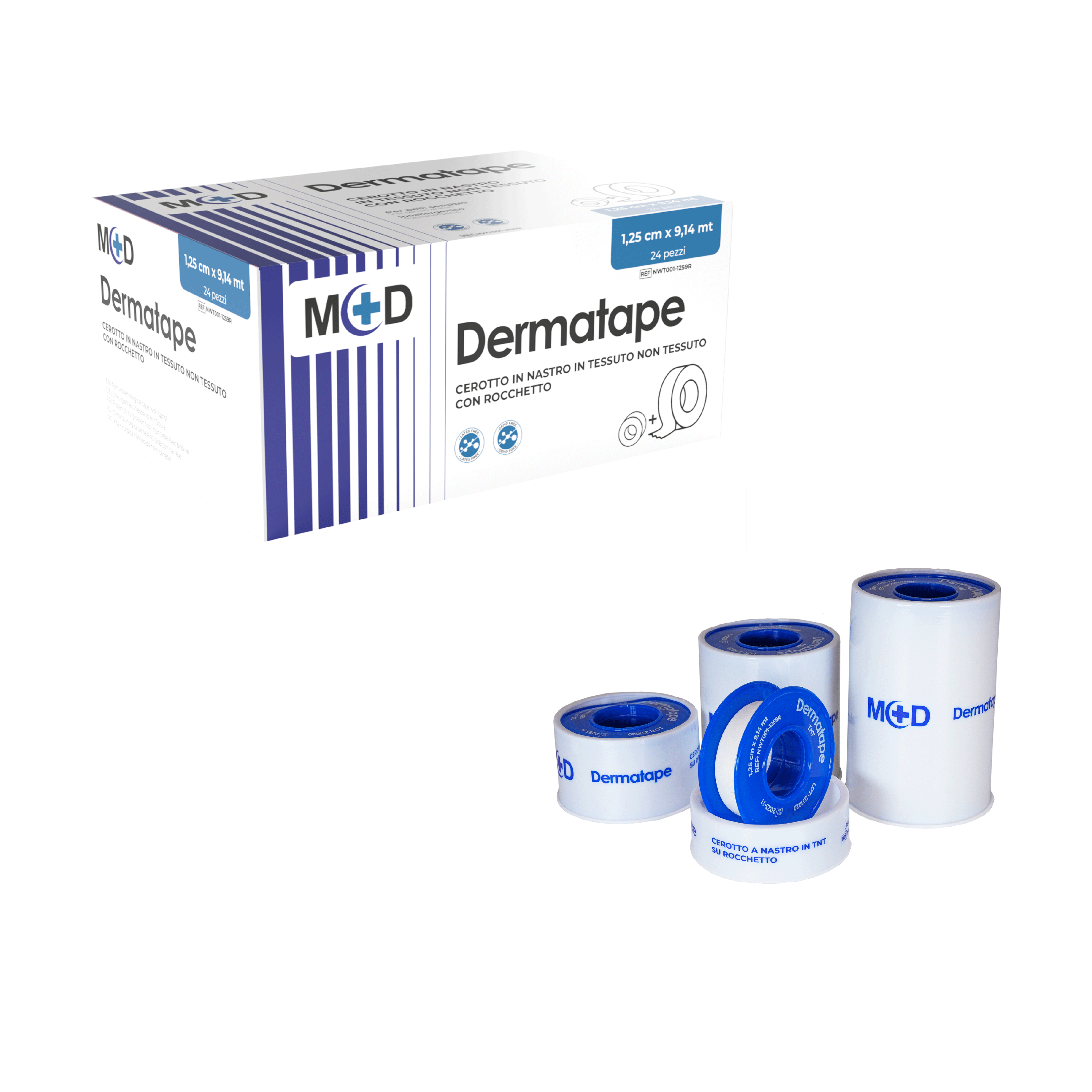 - DERMATAPE TNT: Nastro in tessuto non tessuto opaco, buona conformabilità, ideale per fissaggio generale e zone del corpo che richiedono adattabilità.