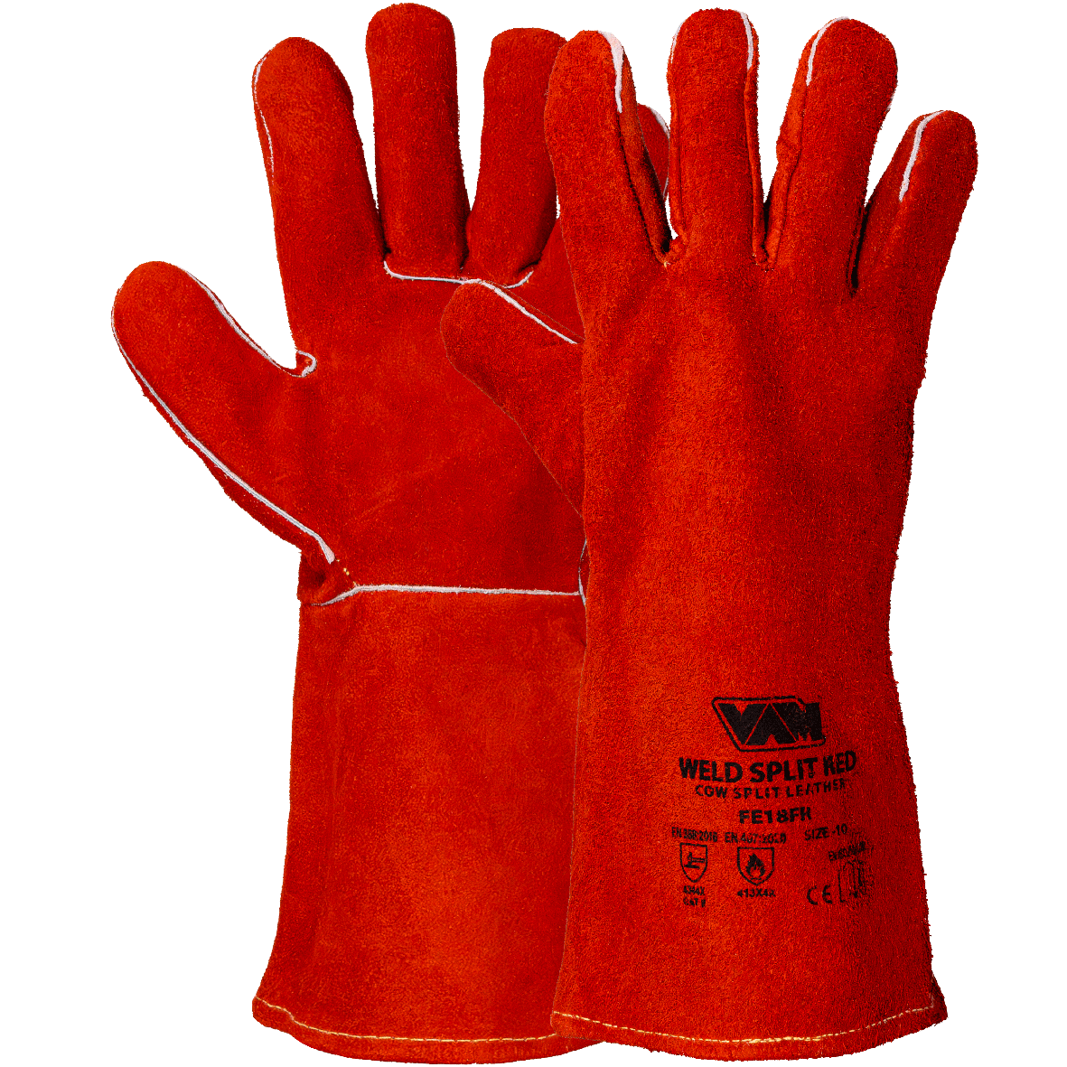- Weld Split Red (Rosso - SKU: FE18FR): Guanto da saldatura in pelle crosta bovina rossa e interno in cotone. Certificato EN 388 4344X, EN 407 413X4X.