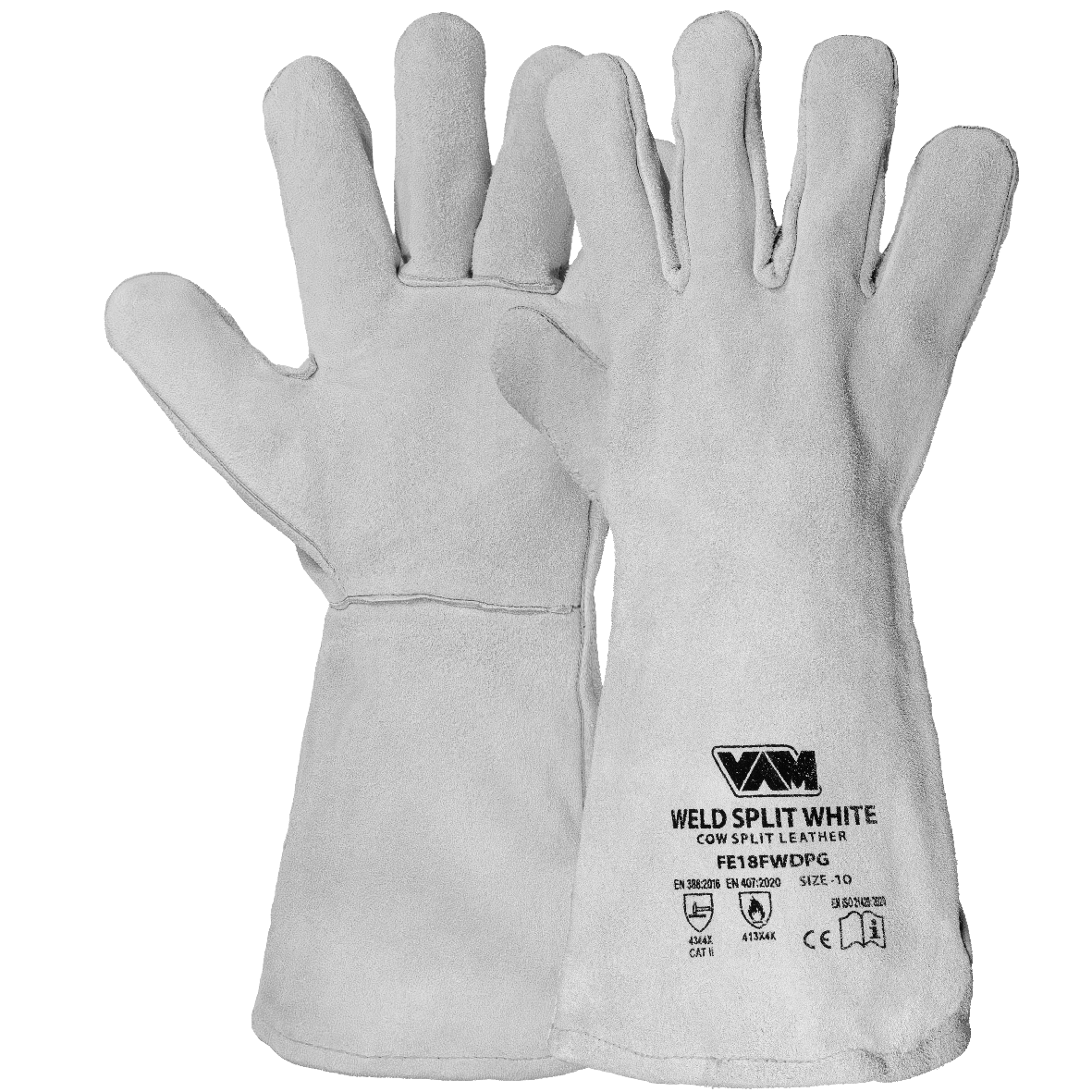 - Weld Split White (Bianco - SKU: FE18FWDPG): Guanto da saldatura in pelle crosta bovina bianca e interno in cotone. Certificato EN 388 4344X, EN 407 413X4X.