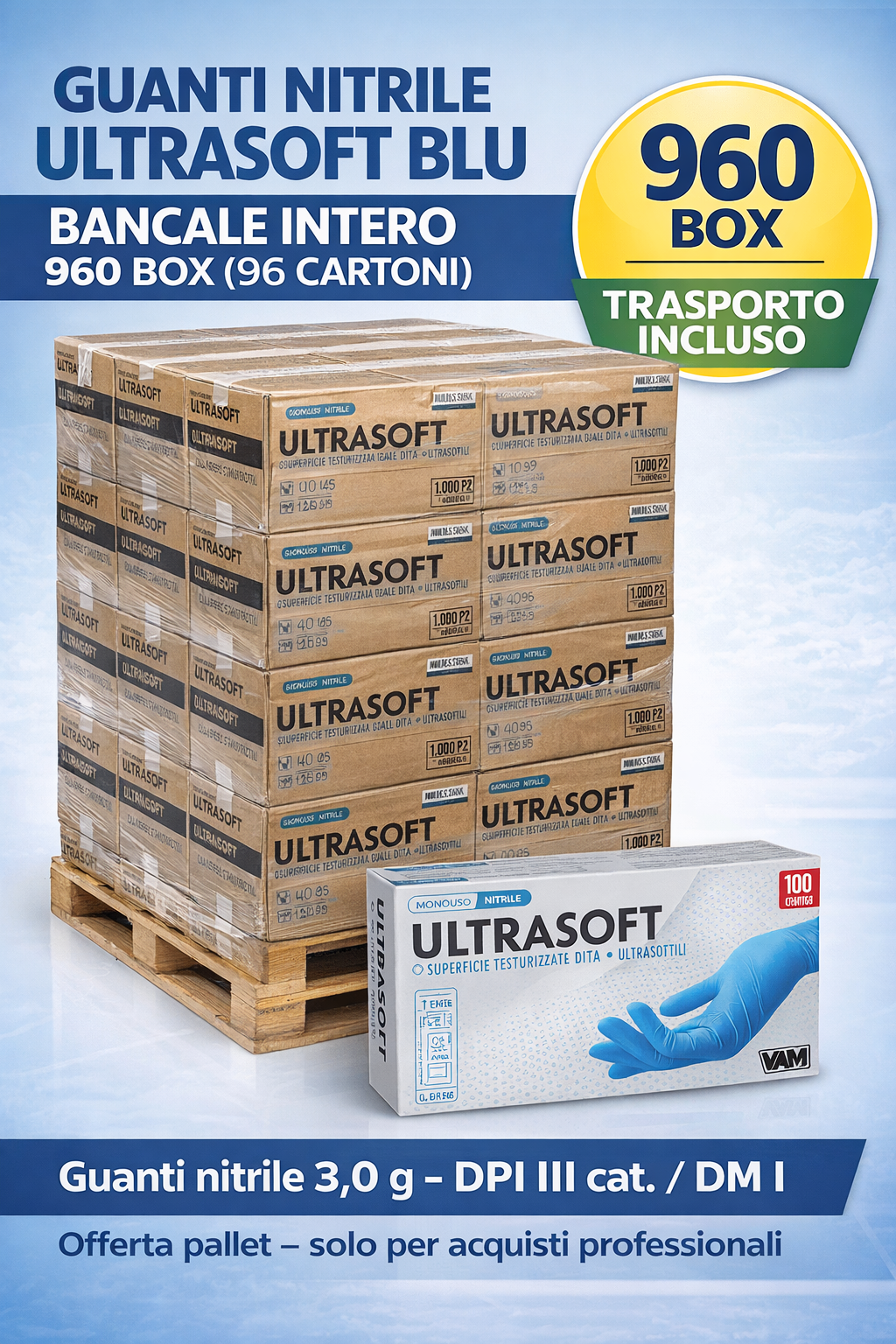 Guanti Nitrile ULTRASOFT Blu 3,0g - Pallet 960 Box - DPI III Cat. / DM Classe I - Trasporto Incluso