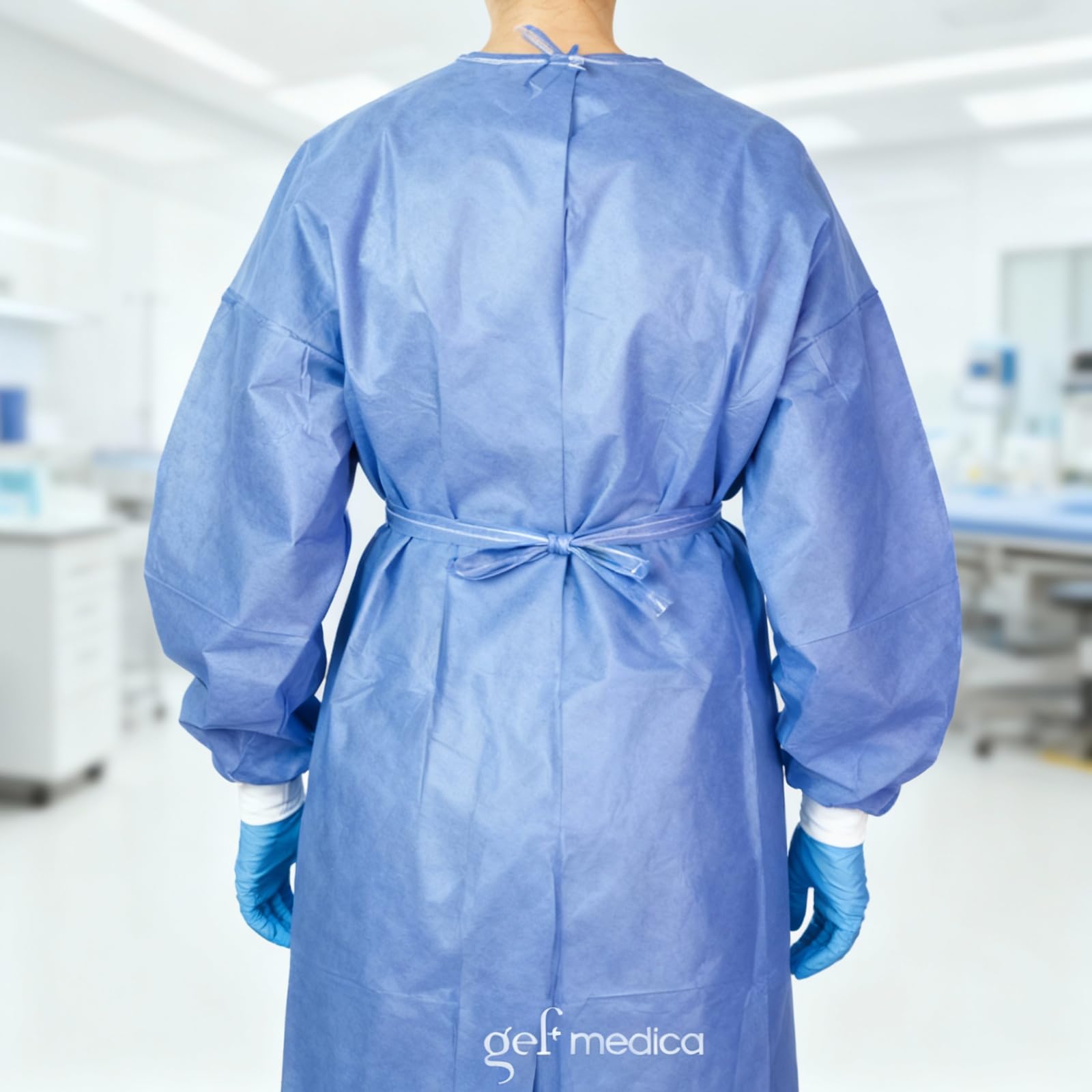 Camice monouso professionale in SMS azzurro con polsini in puro cotone e chiusura posteriore regolabile.
