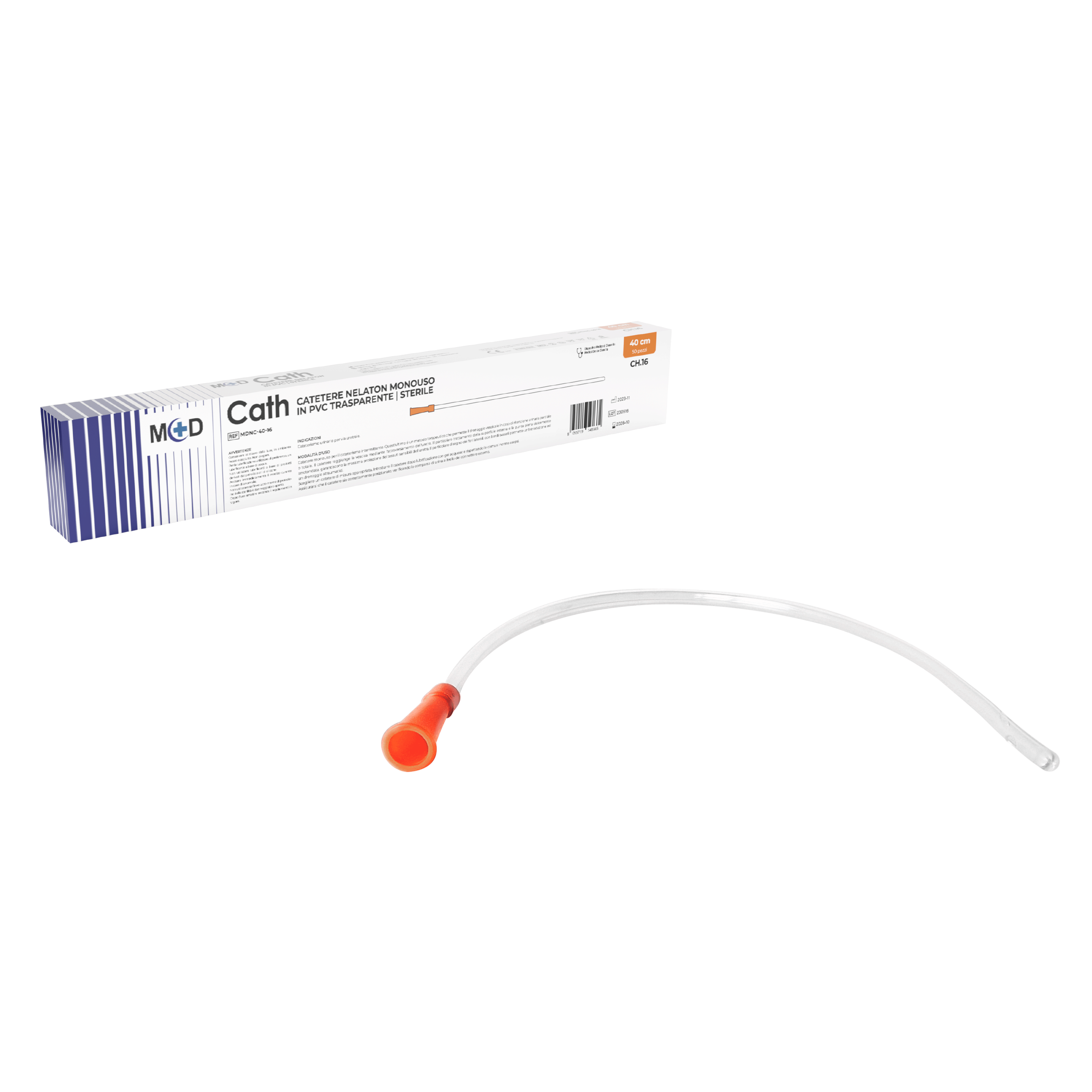Catetere Nelaton maschile in PVC trasparente da 40 cm, sterile, monouso e apirogeno. Realizzato in materiale latex free, assicura una buona flessibilità e tollerabilità durante la procedura di cateterismo intermittente. La lunghezza di 40 cm, adatta ad anatomia maschile, facilita un inserimento corretto e permette un drenaggio vescicale efficace in caso di ritenzione urinaria parziale o totale. Dotato di connettore colorato secondo codice colore europeo per una rapida identificazione della misura. Sterile EO. DM di Classe IIa.