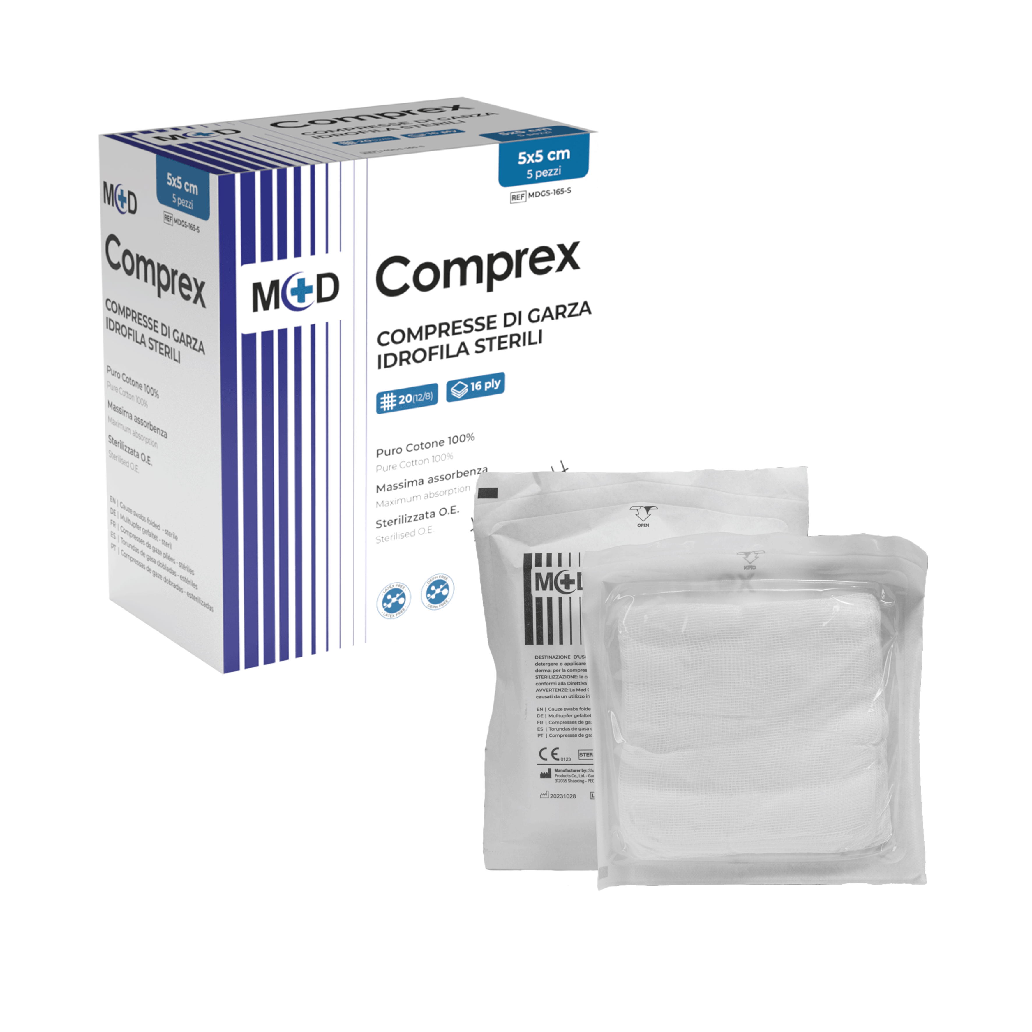 - COMPREX STERILI (DM classe IIa): Sterilizzate con ossido di etilene, confezionate in blister da 5 garze. Indicate per medicazioni sterili, ferite chirurgiche, procedure che richiedono ambiente sterile.
