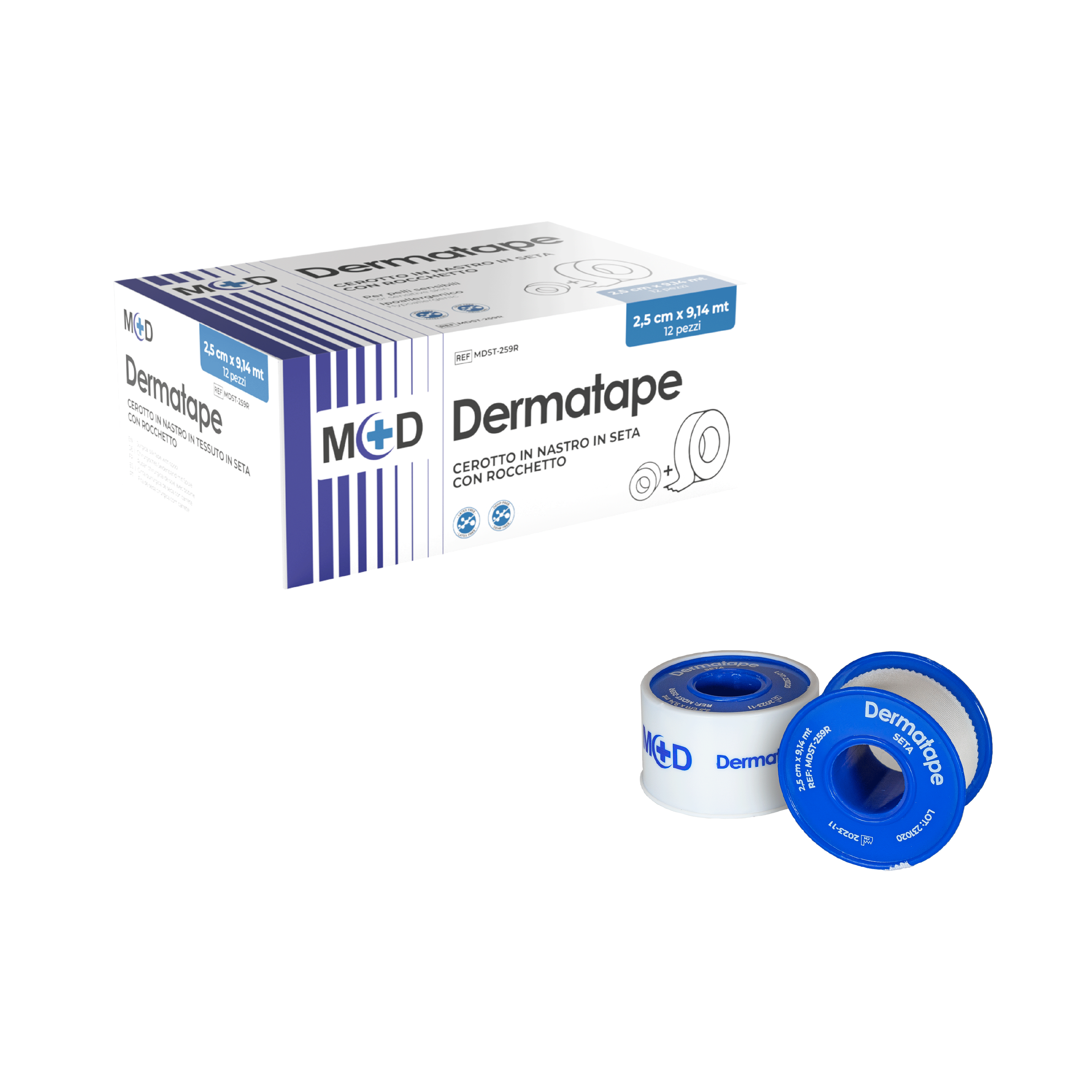 - DERMATAPE ZINCO: Nastro con ossido di zinco, maggiore resistenza all'umidità, ideale per fissaggio prolungato.